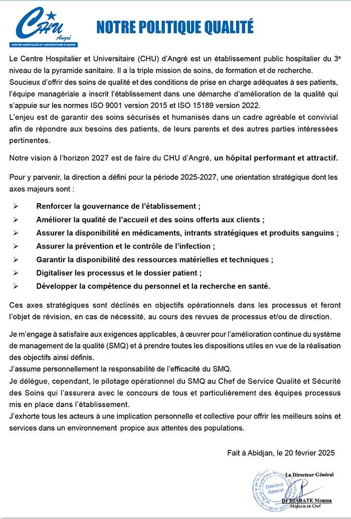 Soucieux de favoriser l'amélioration des conditions de prise en charge des patients, le CHU d'Angré s'inscrit dans une démarche qualité continue. L'enjeu est de garantir des soins personnalisés aux besoins des patients et d'optimiser la sécurité des personnes et des biens.
